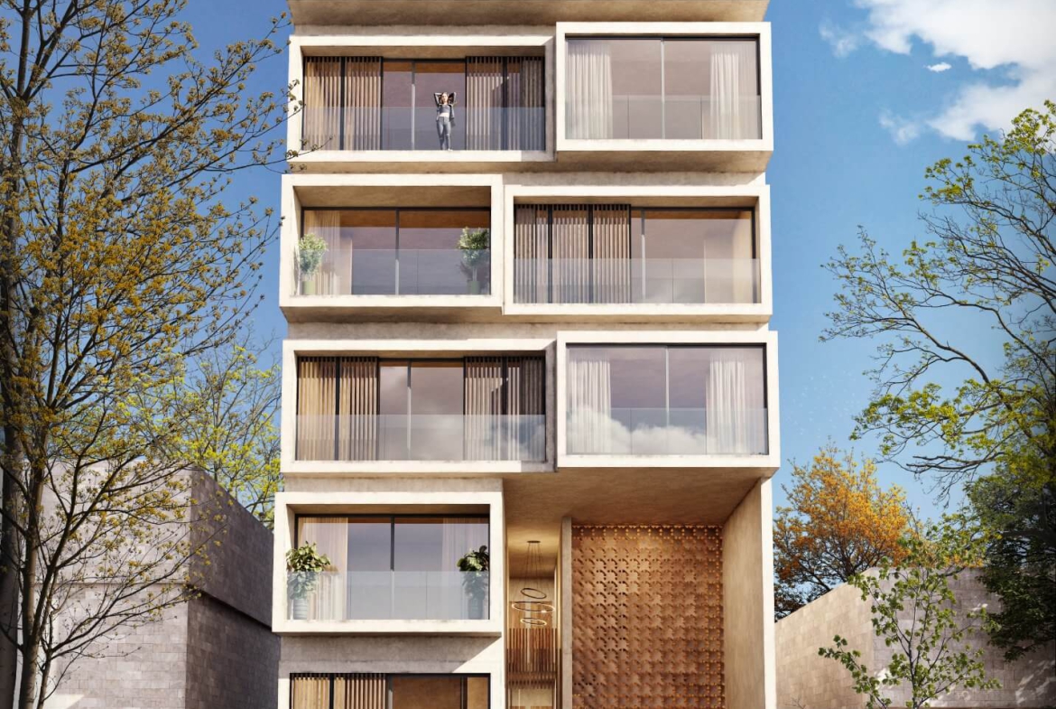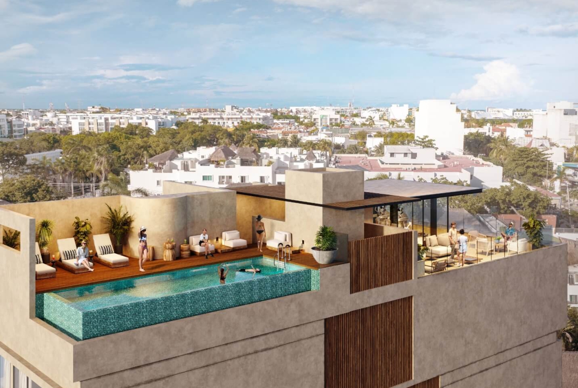 Belle Ame Playa del Carmen is an exclusive residential tower with 21 apartments spread over six levels and a rooftop terrace for sale in Playa del Carmen. It features mezzanine apartments, studios, two-bedroom units, and penthouses. Belle Ame includes amenities such as luxury finishes, private parking, bicycle parking, an elevator, controlled access, 24/7 security, and premium rooftop amenities such as an infinity pool, sundeck, and multipurpose room.